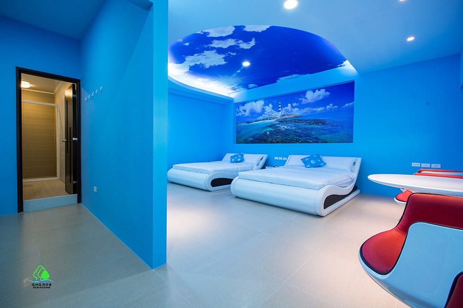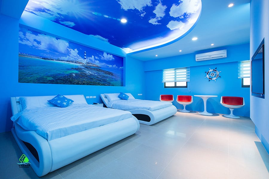 說到澎湖,大家都知道這是一個四面環海的小島,本房型就是以海洋為概念而設計。 讓熱愛海洋的旅人,感受身在海上,遠眺目斗嶼燈塔的感覺。 在白天,抬頭能看到湛藍的天空及熱情的陽光照耀著你。 在夜晚,抬頭能看到夜晚的星空陪伴著你入睡。 旅人們~~~快來體驗這充滿海洋風情的感覺吧!!!